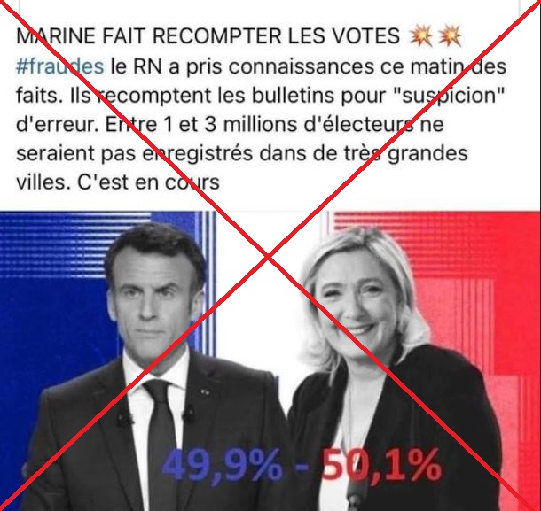 "Marine fait recompter les votes" : depuis l'annonce de la victoire d'Emmanuel Macron face à Marine Le Pen avec officiellement 58,55% dimanche soir, plusieurs publications partagées des milliers de fois sur Twitter comme sur Facebook déclarent que le parti de la candidate du Rassemblement national aurait décidé de "recompter les bulletins pour 'suspicion' d'erreur".