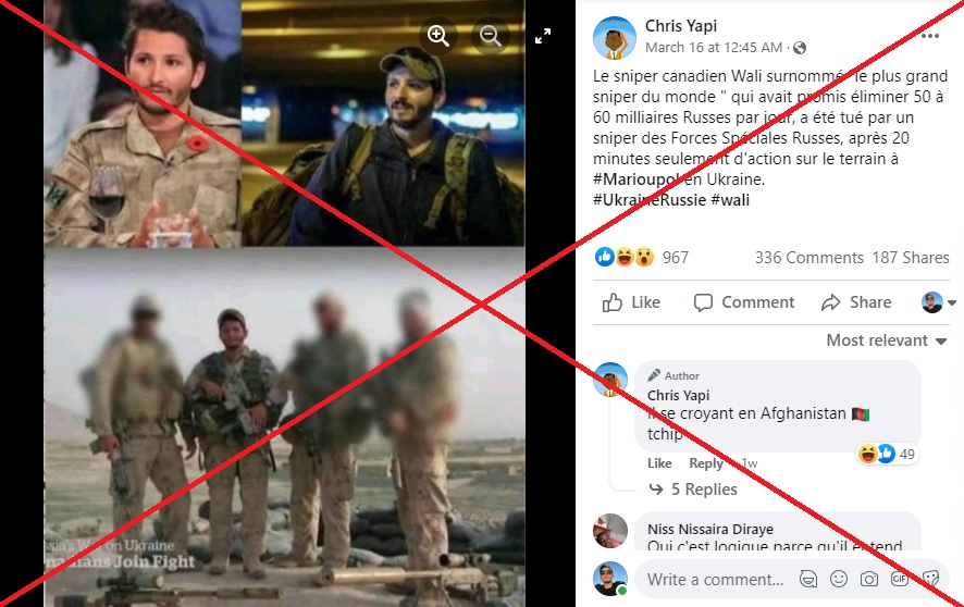 "Wali", un tireur d'élite canadien, aurait été tué par les forces russes "après 20 minutes seulement d'action sur le terrain" dans la guerre qui oppose la Russie et l'Ukraine depuis fin février, selon plusieurs publications partagées plus de 300 fois depuis le 16 mars en Afrique subsaharienne. C'est faux: le Canadien, qui réfute être le "meilleur tireur d'élite du monde" comme le prétendent les internautes, a donné plusieurs preuves de vie depuis cette date.