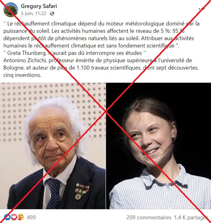 La citation de Antonino Zichichi est tirée d'une tribune publiée dans le quotidien conservateur italien Il Giornale le 30 septembre 2019. Dans le dernier paragraphe de cette tribune, le scientifique italien assure que le climat et la pollution sont "deux choses totalement différentes" et que le réchauffement climatique "dépend du moteur météorologique dominé par la puissance du soleil. Les activités humaines affectent le niveau de 5 %: 95 % dépendent plutôt de phénomènes naturels liés au soleil".