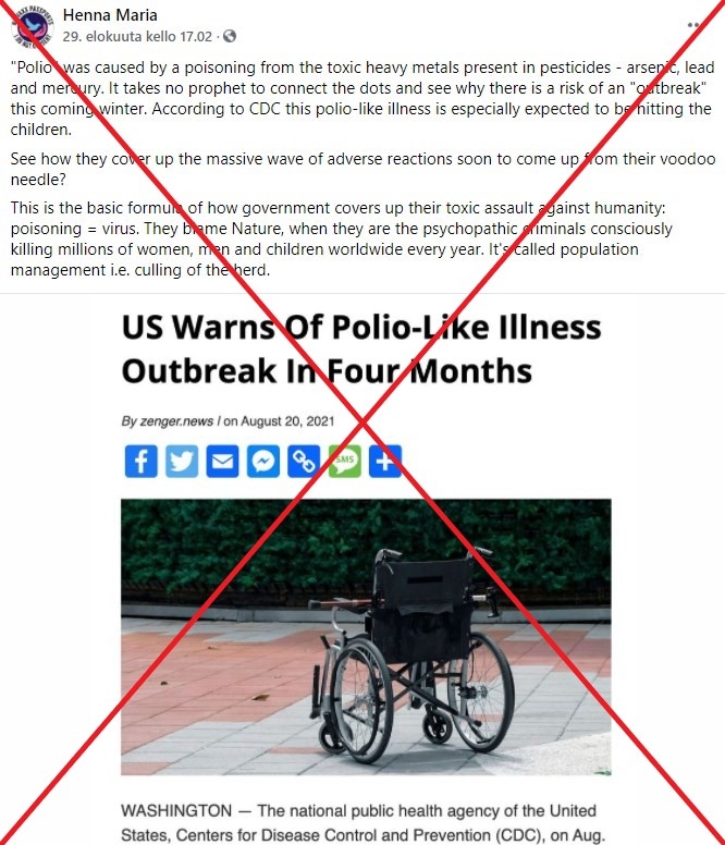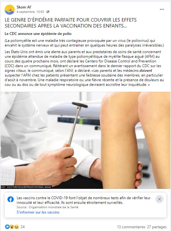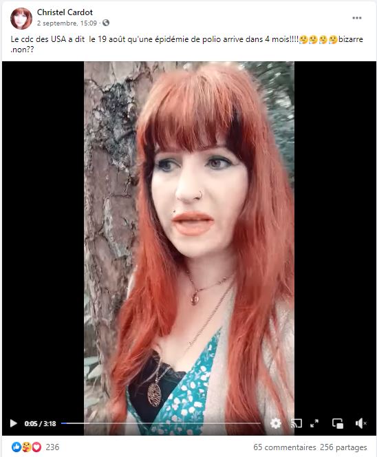 "Le cdc des USA a dit le 19 août qu'une épidémie de polio arrive dans 4 mois!!!bizarre .non??", a également soutenu une internaute s'exprimant face caméra, dont la vidéo a été partagée plus de 250 fois sur Facebook depuis le 2 septembre, appelant à ne pas vacciner les enfants contre le Covid.