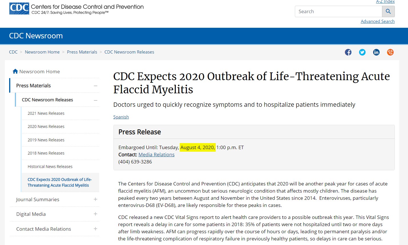 Zenger a mis fin à sa relation avec ANI en août 2021, a également précisé Nate Miller. Au moment de la rédaction de cet article, l'article est toujours disponible sur le site de l'Asian News International. L'agence indienne attribue elle-même l'article à Sputnik News, une agence de presse publique russe. Mais après une recherche par mot-clé, Sputnik n'a pas fait état récemment d'un tel avertissement du CDC concernant l'AFM en août 2021. L'agence avait publié un article sur le sujet en août 2020, qui fait correctement état de l'alerte initiale des CDC.