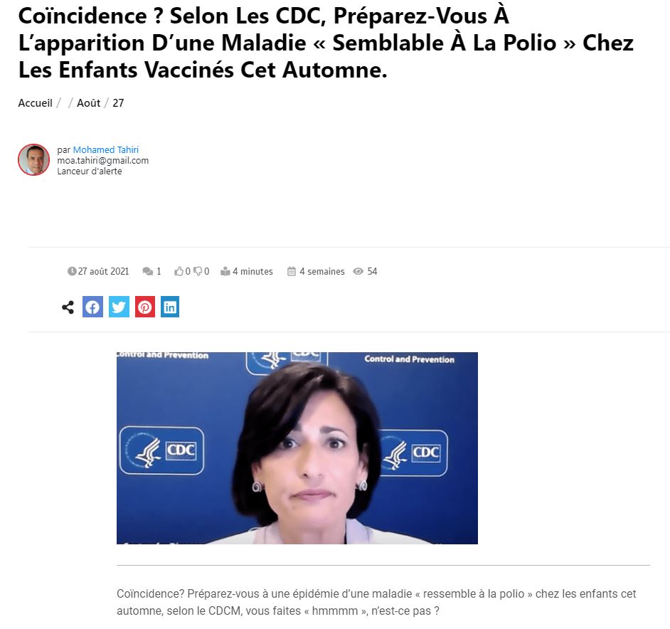 "Une épidémie potentielle d'une maladie semblable à la polio connue sous le nom de myélite flasque aiguë, selon le CDC, pourrait affecter les enfants aux États-Unis cet automne (...) Nous savons que la paralysie de Bell est l'un des effets indésirables probables du « vaccin », il n'est donc pas si farfelu de croire que les injections de Covid pourraient provoquer quelque chose de similaire chez les jeunes ", peut-on lire sur un article du site francemediasnumerique publié le 23 septembre.