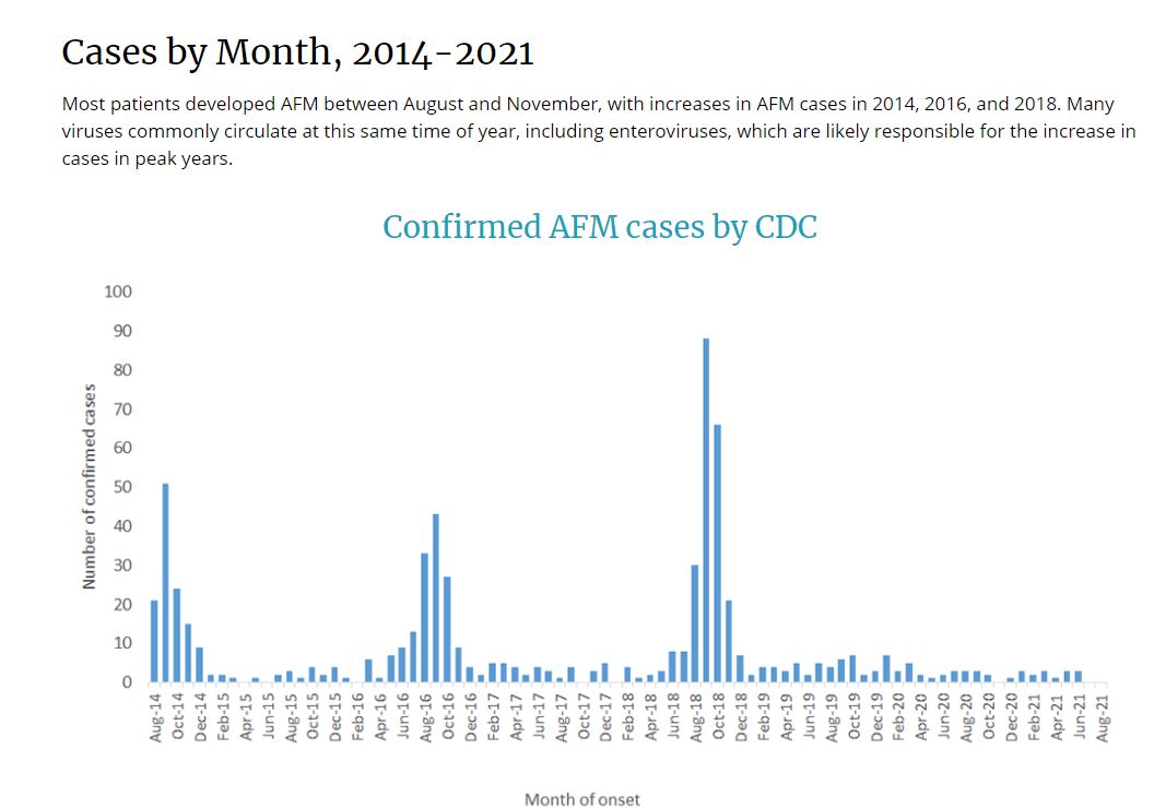 Selon les données des CDC, la plupart des patients "ont développé la myélite flasque aiguë entre août et novembre, avec une augmentation des cas en 2014, 2016 et 2018."