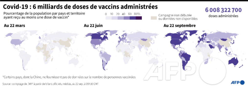 A l'échelle mondiale, plus de six milliards de doses de vaccins contre le Covid ont été administrées à la date du 22 septembre.