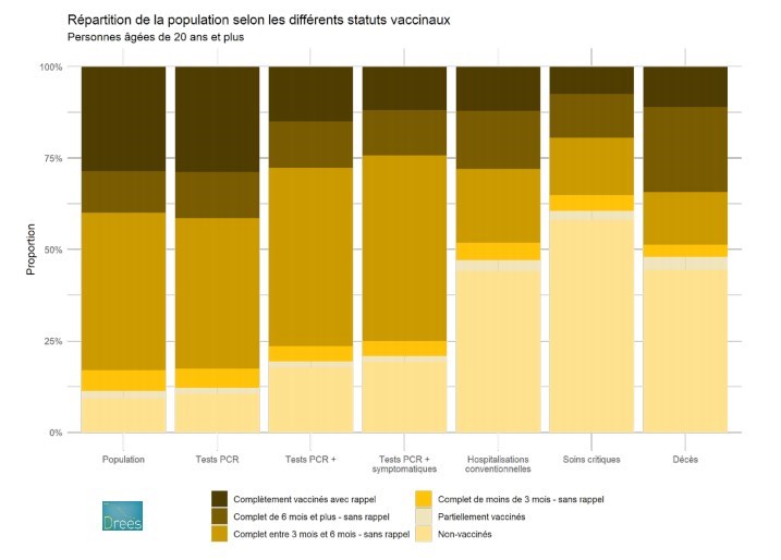 De plus, un communiqué de la Drees soulignait déjà le 7 janvier qu'entre le 29 novembre et le 26 décembre, en soins critiques, 56% des admissions concernaient ainsi des personnes non-vaccinées, alors que celles-ci ne représentent que 8% de la population française parmi les 20 ans et plus.