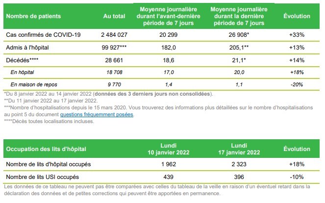 Dans son dernier bulletin épidémiologique du 18 janvier (page 1) l'Institut Sciensano en Belgique recense quant à lui une augmentation du nombre de cas de Covid-19 confirmés admis à l'hôpital. Globalement, le taux d'occupation des lits des hôpitaux progressent (+18% entre le 10 et le 17 janvier) mais le nombre de lits occupés en soins intensifs diminue (-10% sur la même période).