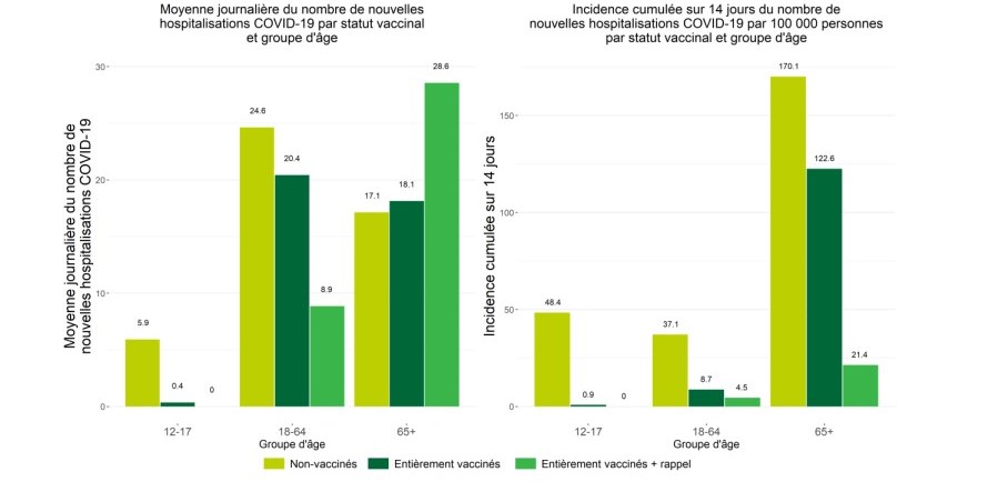 On retrouve en effet dans la dernière version de ce bulletin datée du 14 janvier un tableau (page 29) montrant la moyenne journalière et l'incidence cumulée sur 14 jours pour le nombre d’hospitalisations, par statut vaccinal et par groupe d'âge, pour la période du 27 décembre 2021 au 9 janvier 2022.