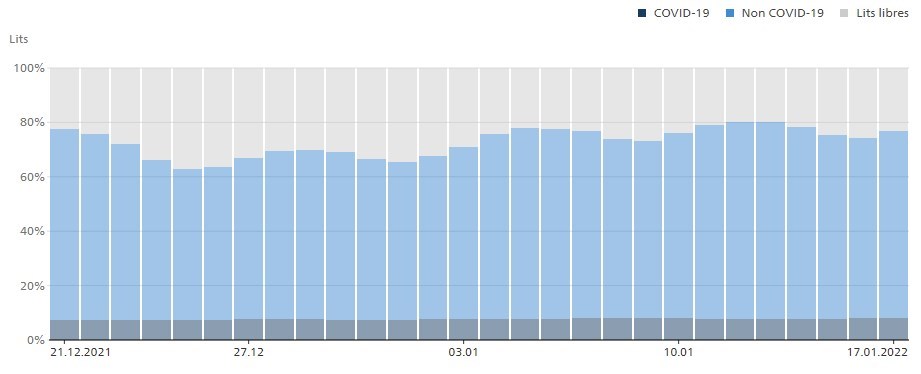 Quant à la Suisse, l'évolution de la capacité hospitalière totale semble indiquer une relative stagnation depuis fin décembre du nombre de lits occupés au total. Selon les dernières données de l'Office fédérale de la santé publique, un peu plus de 23% des lits disponibles étaient vides au 17 janvier, comme le montre ce graphique visualisant l'évolution de la capacité hospitalière totale en Suisse entre le 21 décembre 2020 et le 17 janvier.