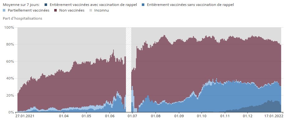 L'Office fédéral de la santé publique suisse recense également le statut vaccinal de toutes les personnes hospitalisées dans le pays, prouvant, de la même manière que la France et la Belgique, que les personnes qui ne sont pas vaccinées contre le Covid-19 sont néanmoins admises en tant que patients dans les hôpitaux suisses.