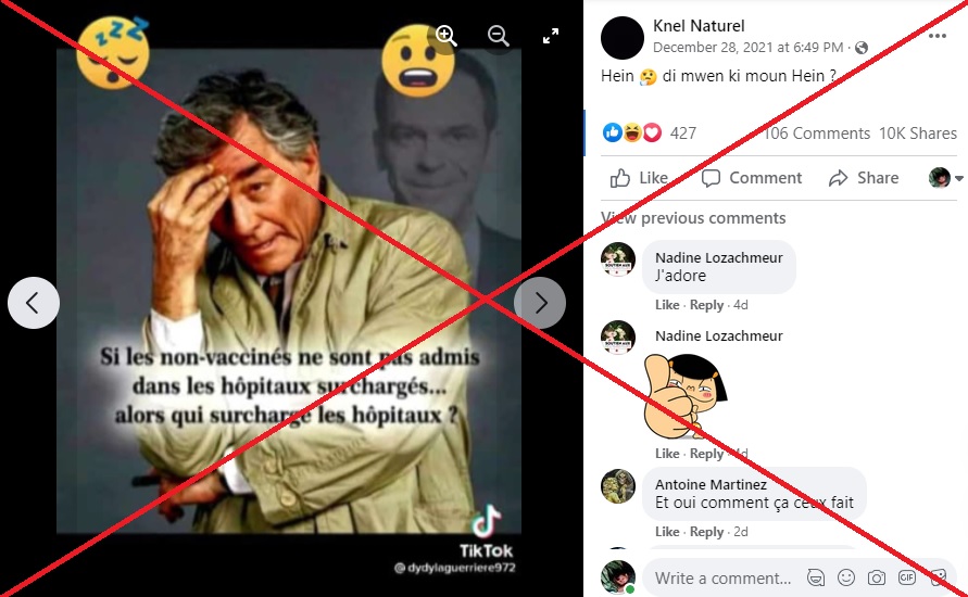 Sur la photo, le célèbre inspecteur Columbo, héros de la série télévisée américaine éponyme, se tient le front, l'air perplexe. Derrière lui, on aperçoit le ministre de la Santé français Olivier Véran, sourire aux lèvres.