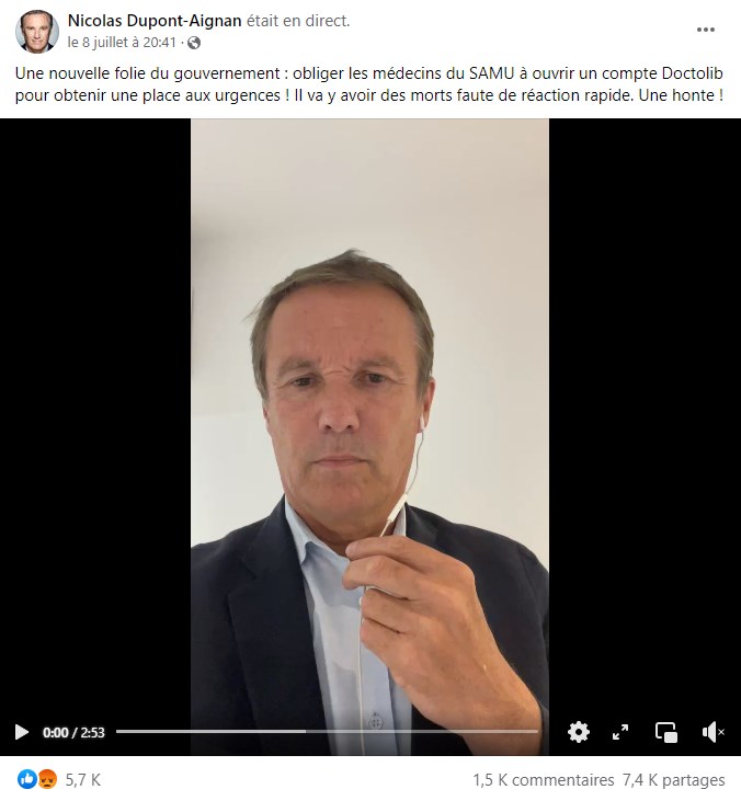 "Le ministre de la Santé propose que les urgentistes, les Samu, passent par Doctolib pour savoir s'ils peuvent emmener un malade aux urgences", affirme Nicolas Dupont-Aignan, député de l'Essonne, dans une vidéo postée sur Twitter et Facebook le 8 juillet et relayée des milliers de fois.