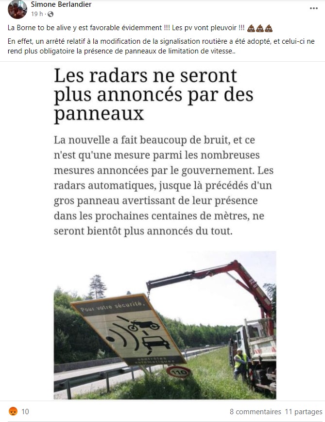 "La nouvelle a fait beaucoup de bruit, et ce n'est qu'une mesure parmi les nombreuses mesures annoncées par le gouvernement. Les radars automatiques, jusque-là précédés d'un gros panneau avertissant de leur présence dans les prochaines centaines de mètres, ne seront bientôt plus annoncés du tout", poursuit le texte visible sur cette image.