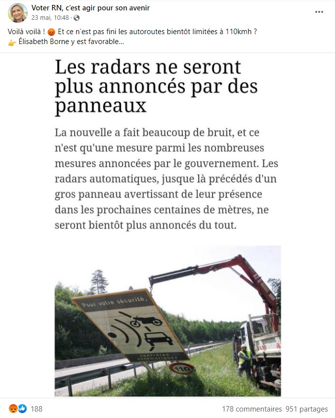 Tous s'appuient sur une capture d'écran relayée des centaines de fois sur Facebook depuis le 23 mai, montrant les premières lignes d'un article intitulé "Les radars ne seront plus annoncés par des panneaux".