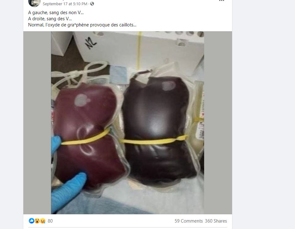 "A gauche, sang des non v..., à droite, sang des v....", écrit un internaute dans l'une de ces publications. "Normal, l'oxyde de graphène provoque des caillots...", ajoute-il.