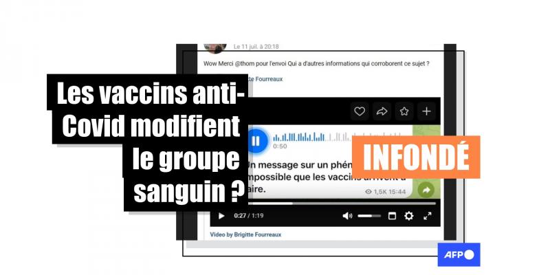 Rien n'indique que les vaccins anti-Covid changent le rhésus ou le groupe sanguin des personnes vaccinées, expliquent des spécialistes, contrairement à ce qu'affirme une note vocale partagée plusieurs centaines de fois depuis mi-juillet sur les réseaux sociaux. Ce phénomène n'a jamais été observé par les établissements de collecte du sang et les médecins interrogés par l'AFP. De plus, ces derniers ont expliqué qu'en l'état actuel des connaissances scientifiques, il est impossible que le groupe sanguin d'un patient change, sauf en cas de greffe de moelle osseuse.