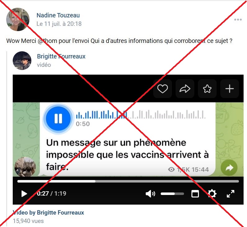 Au début de cette note vocale de près d'une minute trente, partagée plus de 180 fois sur Facebook, un homme affirme avoir "deux patients, un homme et une femme, qui ont, suite à une opération, été vaccinés de 3 doses, apparemment leur rhésus sanguin a changé - chose qui n'existe pas - depuis leur troisième dose". "Tous les hôpitaux savent maintenant que le rhésus sanguin change après la vaccination. Pour ne pas affoler les gens, maintenant ils demandent systématiquement de refaire une prise de sang pour le rhésus (...)", assure-t-il. "Et en fait, les vaccins à partir de deux doses modifient les rhésus après 6,8 mois et en 3 doses après 2,3 mois".