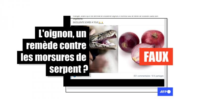 L’oignon serait-il un remède pour soigner une morsure de serpent ? Une publication partagée 18.000 fois sur Facebook depuis fin avril le prétend. L’auteur de ce message viral prescrit de consommer trois gros oignons en cas de morsure, pour "vomir tout le venin" répandu dans l’organisme. Faux, alertent des toxicologues contactés par l’AFP qui expliquent que le seul traitement efficace est un sérum antivenimeux.