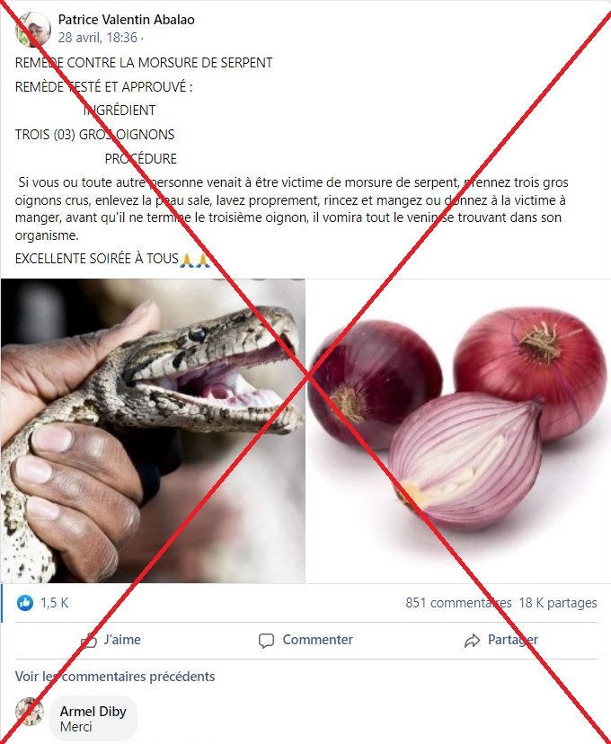 "REMÈDE CONTRE LA MORSURE DE SERPENT. Remède testé et approuvé", assure l’auteur de ce message abondamment relayé en Afrique francophone depuis le 28 avril 2022 (1,2). Selon lui, il suffirait de nettoyer et manger trois gros oignons pour se débarrasser rapidement du venin d’un serpent.