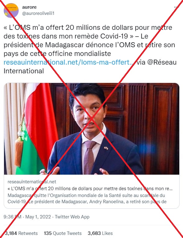 Madagascar claque la porte de l'Organisation mondiale de la santé ? C'est ce que prétendent plusieurs publications, déjà massivement relayées sur Twitter et Facebook en 2020, selon lesquelles le président malgache aurait décidé d'exclure son pays de l'institution en raison d'un "scandale" lié au Covid-19. Cette année-là, Andry Rajoelina s'est effectivement montré critique envers l’OMS qui n'a pas reconnu le Covid-Organics, une boisson présentée par le gouvernement comme un puissant remède contre le coronavirus. Mais il n'a jamais décidé le retrait de Madagascar de l'OMS : "Cette information est complètement fausse", a déclaré le cabinet de la présidence, contactée par l'AFP le 5 mai 2022. Le bureau de l'Organisation mondiale de la santé basé en Afrique a également certifié à l'AFP, le 11 mai 2022, la "présence du pays comme membre de l'OMS".