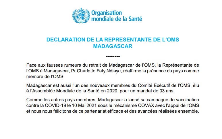 Le drapeau de la République de Madagascar figure d'ailleurs toujours sur le site officiel de l'Organisation mondiale de la santé, à la date du 5 mai 2022.