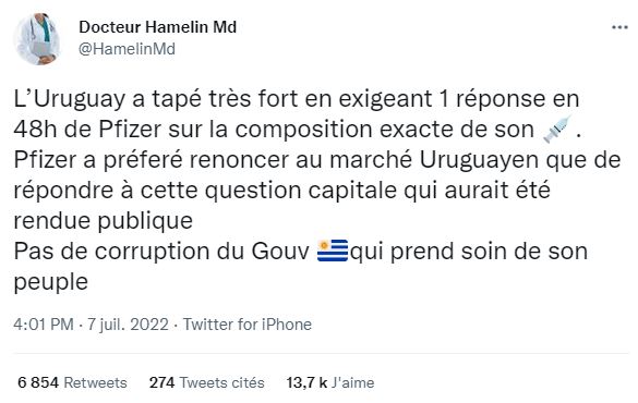 Cette décision contre l'entreprise pharmaceutique a suscité nombre de commentaires au-delà des frontières du pays. En France, plusieurs publications ont salué un "coup de théâtre" qui obligerait Pfizer à dévoiler le contenu de ses vaccins anti-Covid. D'autres tweets partagés plusieurs milliers de fois ont par ailleurs déclaré que l'entreprise avait "préféré renoncer au marché uruguayen que de répondre à cette question capitale qui aurait été rendue publique".