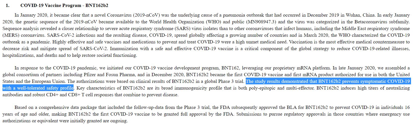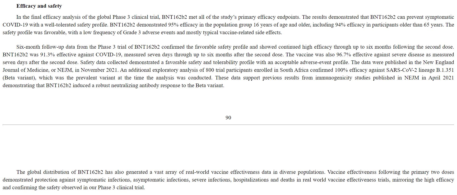 C'est cet extrait qui a suscité des interrogations de la part des internautes, l'entreprise paraissant déclarer qu'elle doute des résultats de son vaccin. Néanmoins, cet extrait est sorti de son contexte. Car dans le même document, BioNTech met bien en avant les résultats positifs de son vaccin à ARN messager, tant concernant son efficacité que son innocuité, y compris contre les variants en circulation actuellement.