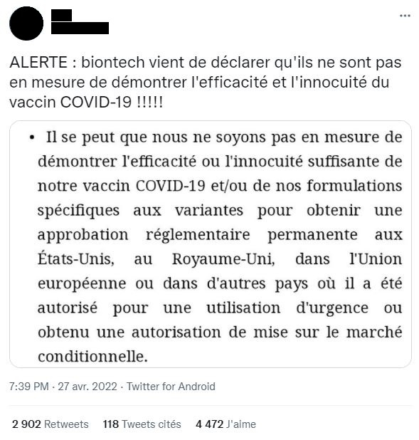 "ALERTE : BioNTech vient de déclarer qu'ils ne sont pas en mesure de démontrer l'efficacité et l'innocuité du vaccin COVID-19", a tweeté un internaute le 27 avril, avant de voir sa publication partagée plus de 3.000 fois. Des publications similaires ont également ciblé ce laboratoire pharmaceutique allemand, à l'origine du premier vaccin à ARN messager contre le Covid-19 en partenariat avec Pfizer, aussi bien sur Facebook (1, 2) que Twitter (1), Telegram ou des sites Internet (1, 2).