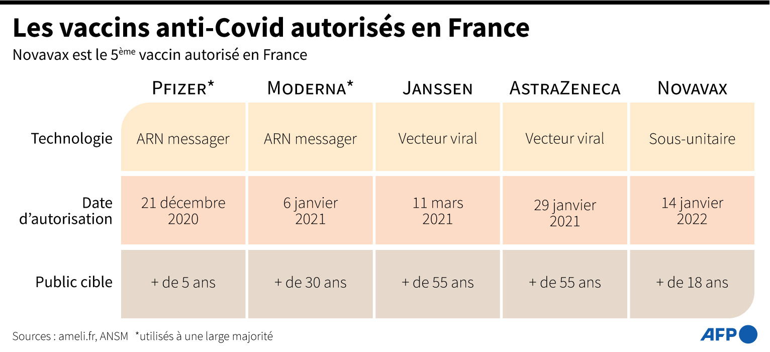 Tableau montrant les cinq vaccins contre le Covid-19 autorisés en France ( AFP / Emmanuelle MICHEL, Valentina BRESCHI)