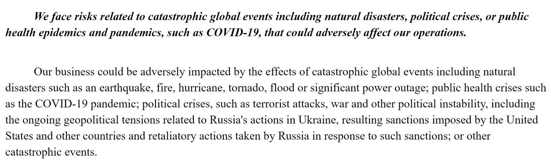 Dans un email daté du 6 mai, la société explique : "[Cette section sur] les facteurs de risque [doit] informer pleinement sur les risques potentiels que les investisseurs considèreraient comme fondamentaux pour leurs décisions d'investissements ou de vote. [Elle] ne décrit pas les événements qui se sont réellement produits ou se produiront."