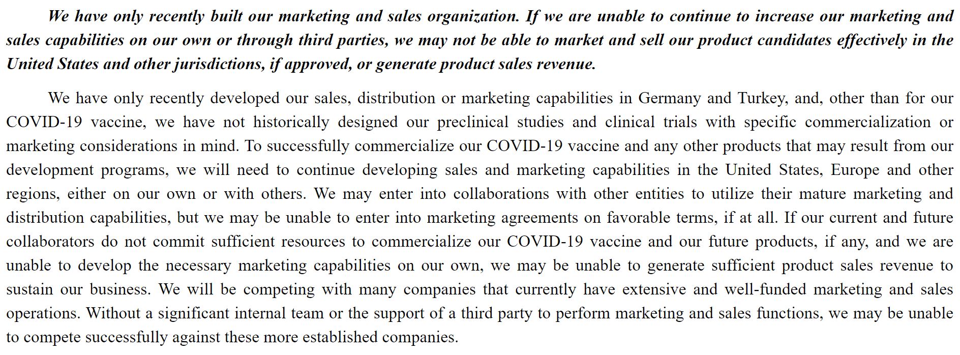 L'objectif du formulaire est donc plutôt d'indiquer les risques financiers qui pourraient survenir lors de scénarios poussés à l'extrême. De ce fait, les sociétés cotées comme BioNTech sont légalement tenues de lister les risques commerciaux les plus pertinents dans leurs rapports annuels, pour informer de potentiels investisseurs.
