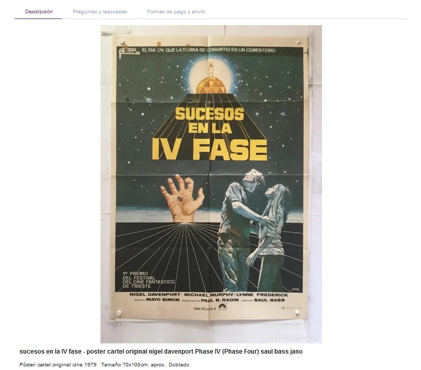 Une recherche d'image inversée permet de trouver la version originale de l'affiche, dont une version a été mise en vente sur le site marchand hispanophone todocoleccion : il s'agit d'un poster du film de science-fiction Phase IV, sorti en 1974, est réalisé par l'Américain Saul Bass.