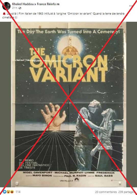 "Le voilà ! Film italien de 1963 intitulé à l'origine 'Omicron le variant (sic)'", écrit un internaute sur Facebook dans une publication partagées plus de 3.000 fois en 24 heures. La photo d'une affiche de film vintage accompagne le texte, comme dans de nombreuses autres publications similaires en français (1,2), mais aussi en allemand et en espagnol.