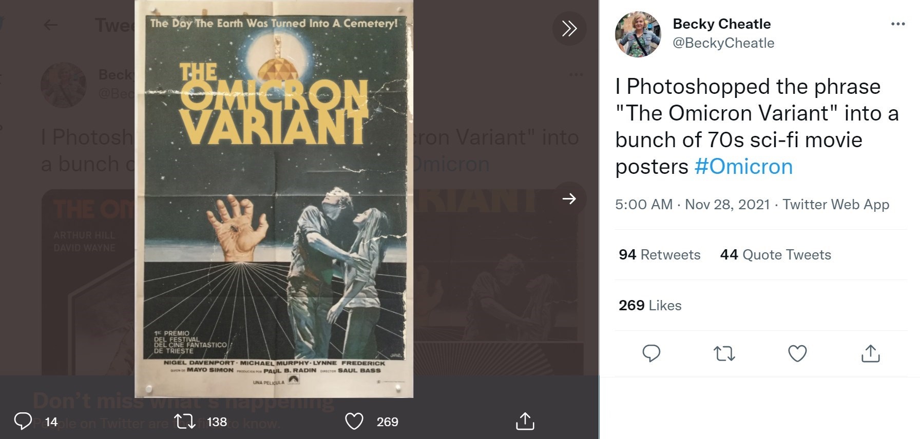 Elle l'a diffusé le 28 novembre, accompagné du texte suivant : "J'ai incrusté la phrase 'The Omicron Variant' (le variant Omicron, NDLR) sur un tas d'affiches de film de science-fiction des années 1970".