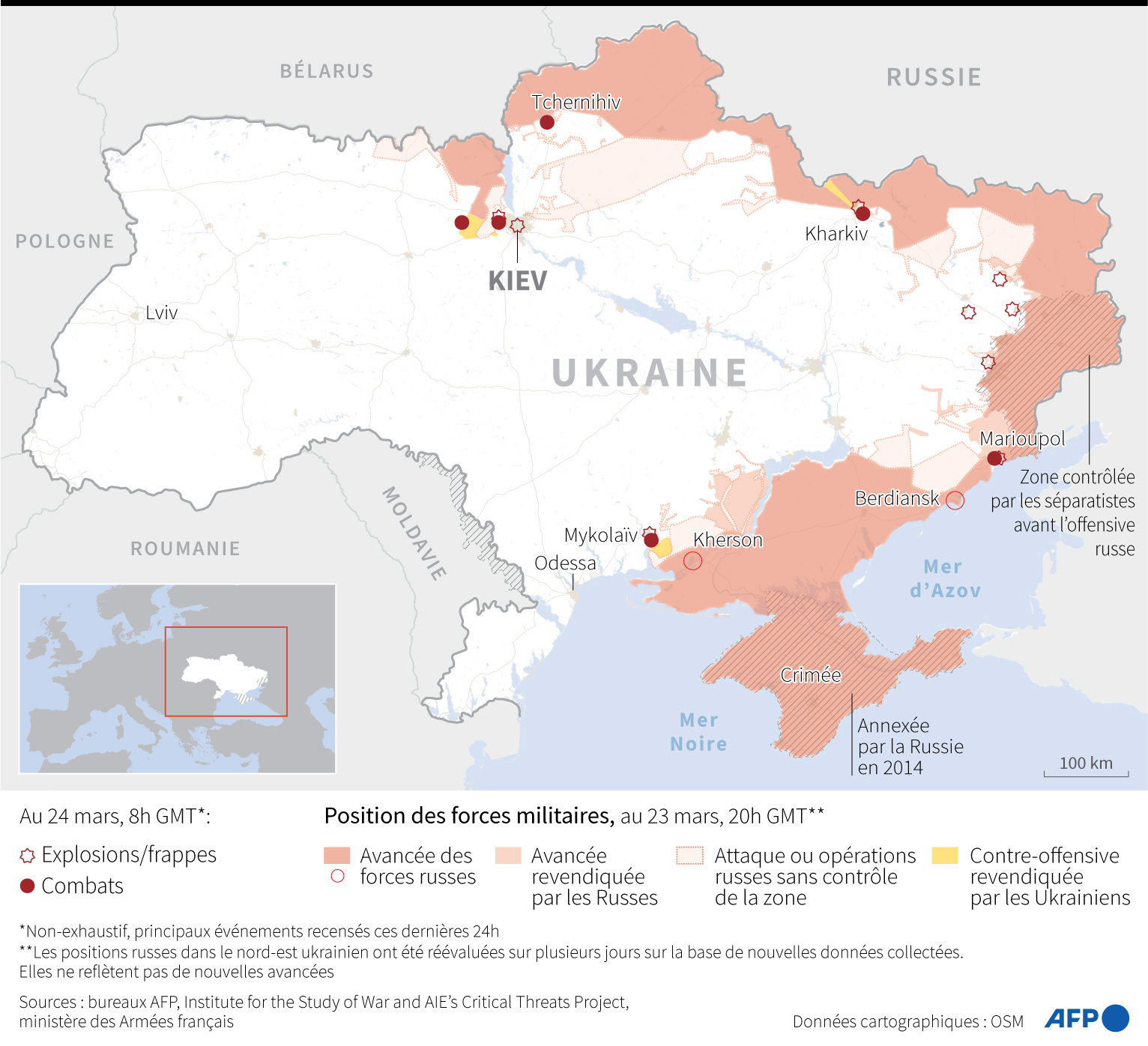 Le ministère de l'Intérieur a fourni à l'AFP les chiffres des remontées de la Police aux frontières : le 19 mars, on recensait 23.027 personnes fuyant l’Ukraine passées sur le territoire français depuis le déclenchement du conflit, "dont 22.592 ressortissants ukrainiens".