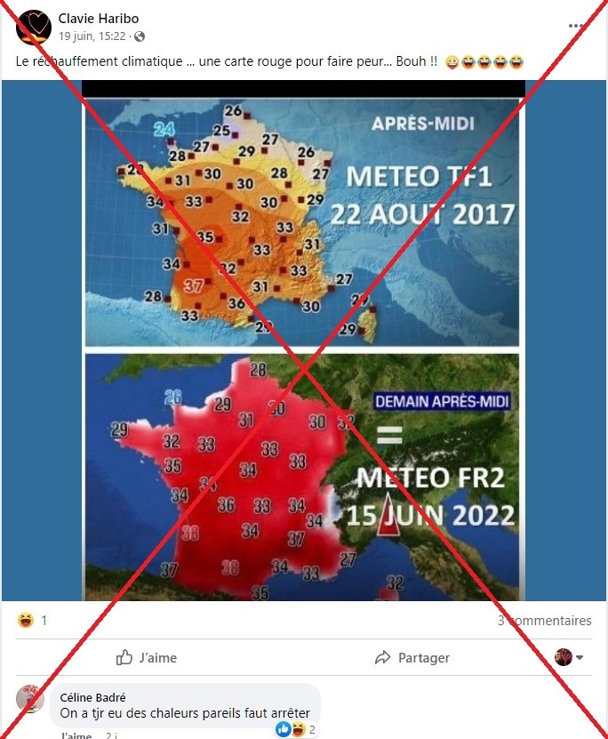 “Ceci n’est pas du tout de la manipulation”, ironise une phrase au bas de ce comparatif relayé des milliers de fois sur Facebook (1, 2) et sur Twitter (3) depuis le 16 juin. Parmi les internautes qui le partagent, l’un dénonce notamment "une carte rouge pour faire peur", en lien avec "le réchauffement climatique".