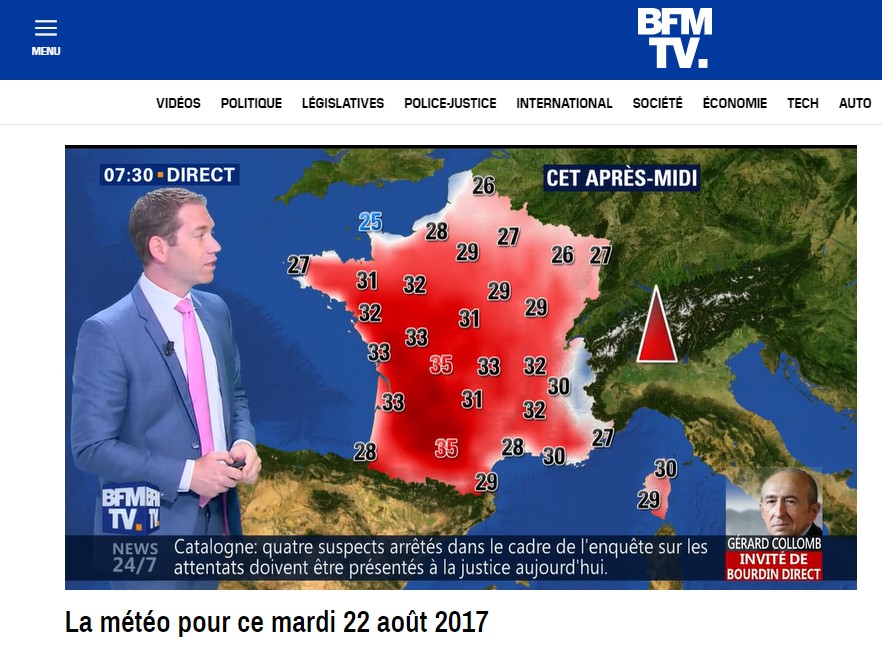 De plus, si le visuel compare les cartes de deux chaînes différentes diffusées à cinq ans d’intervalle, à la date du bulletin météo de TF1 pris en exemple (le 22 août 2017), France 2 comme BFMTV avaient diffusé une carte présentant les mêmes températures sur un fond complètement rouge.