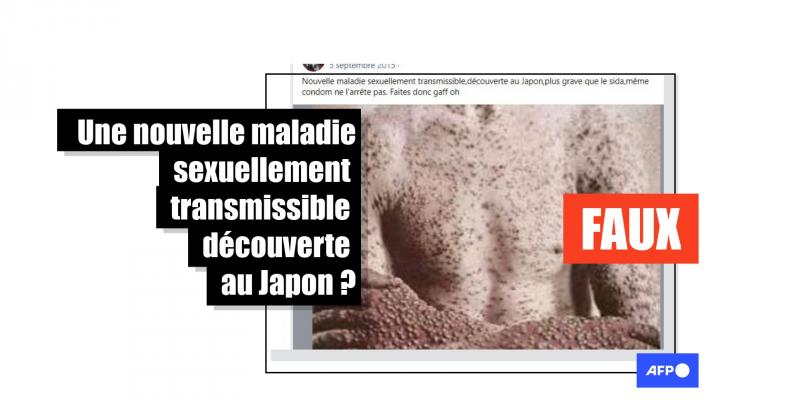 Un message viral en Afrique francophone sur Facebook depuis 2015, toujours partagé en avril 2022, prétend, photo à l’appui, qu’une "nouvelle maladie sexuellement transmissible" a été découverte au Japon. Cette maladie serait "plus grave" que le VIH et les préservatifs ne seraient d'aucune utilité. Mais c'est faux, ont déclaré l’OMS et le ministère japonais de la Santé à l'AFP: aucune nouvelle MST n'a été récemment découverte au Japon. De plus, l’image associée à cette rumeur montre en réalité les symptômes de la variole, éradiquée depuis plus de 40 ans.