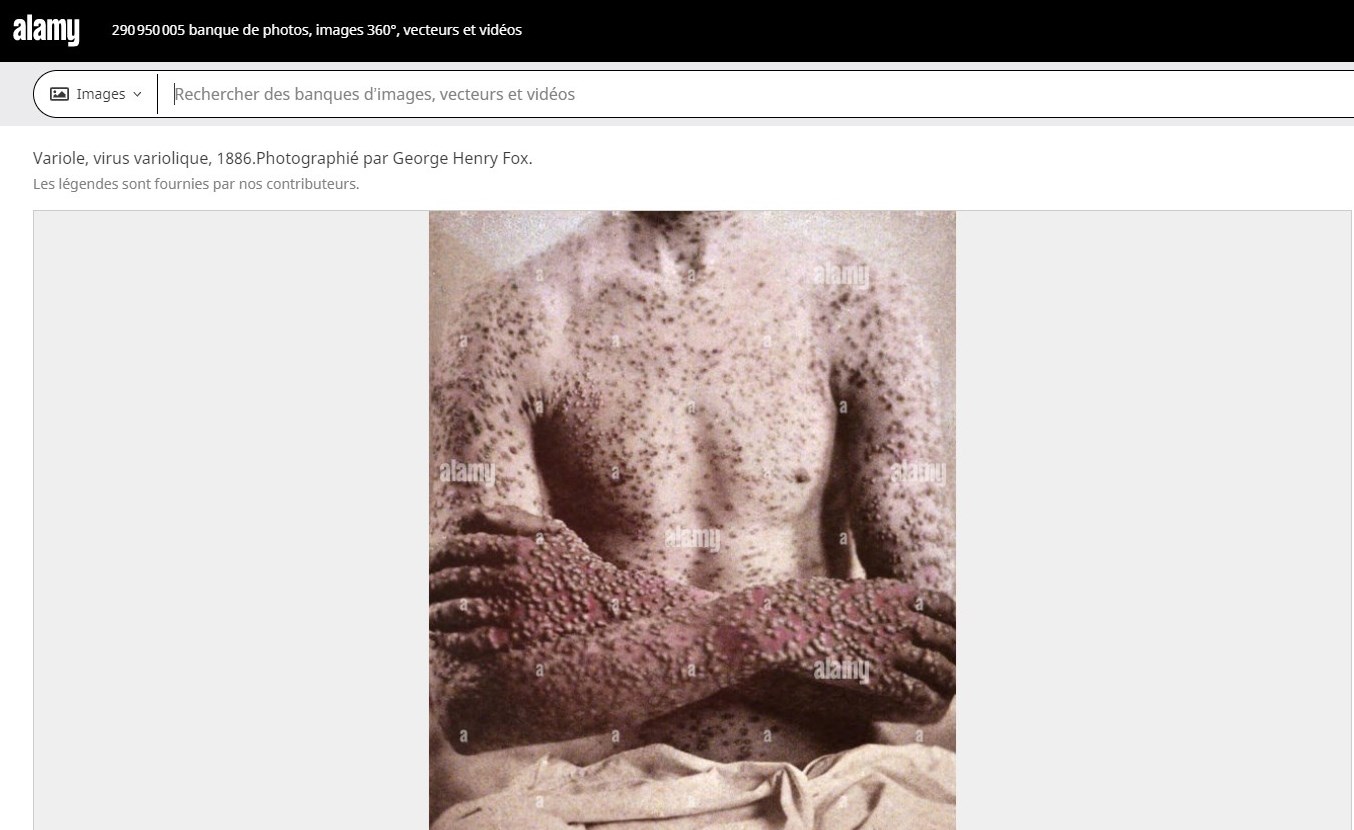 Nous avons effectué une recherche d’image inversée (voici comment procéder) et l’avons retrouvée dans la banque d’images du portail Alamy. La légende qui l'accompagne indique qu’elle montre un homme atteint de variole et photographié par Georges Henry Fox en 1886.