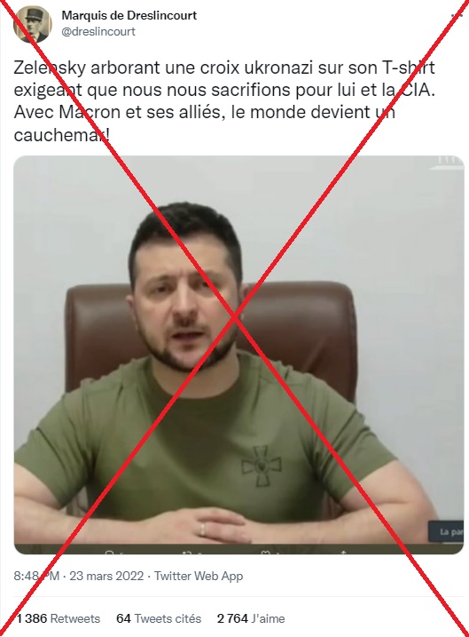 "Zelensky arborant une croix ukronazi sur son T-shirt exigeant que nous nous sacrifions pour lui et la CIA", prétend un tweet, partagé plus de 1.300 fois depuis le 23 mars, relayant une image sur laquelle on voit le président ukrainien arborant un T-shirt kaki, sur lequel on peut voir une croix.