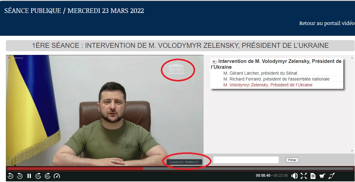 Le 23 mars, c'est aux parlementaires français, réunis à cette occasion, que Volodymyr Zelensky a demandé de l'aide pour son pays en visioconférence. Le visuel repris dans le tweet viral sur les réseaux sociaux est extrait de cette intervention, comme en témoignent le logo de l'Assemblée, ainsi qu'une partie du bandeau introduisant l'intervenant présents sur l'image.