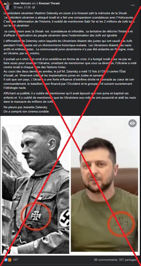 "Le président ukrainien Vladimir (sic) Zelensky en zoom à la Knesset salit la mémoire de la Shoah", renchérit un autre post Facebook, partagé à plus de 300 reprises depuis le 20 mars, assorti d'un montage de deux photos, l'une montrant le président ukrainien avec son T-shirt kaki, et l'autre montrant Adolf Hitler en uniforme militaire.