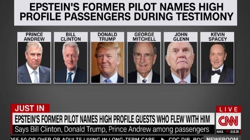 Capture d'écran prise le 13 décembre 2021 montrant une vidéo de CNN archivéeDans une transcription (en anglais) de l'émission, on peut également lire que, selon la journaliste à l'antenne, l'ex-pilote d'Epstein a cité "le Prince Andrew, les ex-présidents américains Bill Clinton et Donald Trump, les sénateurs George Mitchell et John Glenn et l'acteur Kevin Spacey".