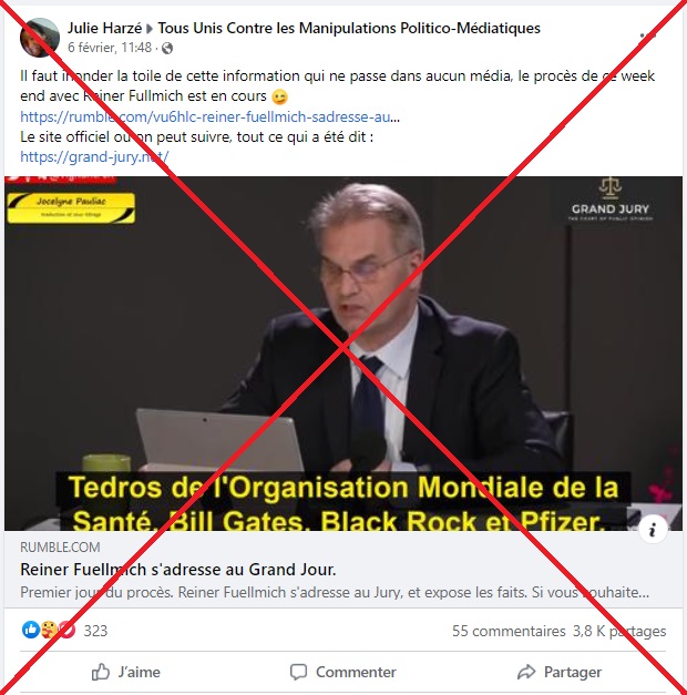 Dans une vidéo d'un prétendu "Tribunal populaire de l'opinion publique" diffusée le 5 février sur les réseaux sociaux, une organisation qui enquêterait sur des soupçons de "crimes contre l'humanité" contre l'Organisation mondiale de la santé (OMS), le Forum de Davos et des scientifiques, l'avocat allemand Reiner Fuellmich a déclaré que les "accusés" avaient planifié et imposé au monde une "fausse pandémie". Cependant, cela ne repose sur aucun fondement juridique. Le discours de Fuellmich se base par ailleurs sur de fausses informations et des théories du complot qui ont circulé tout au long de la crise sanitaire.