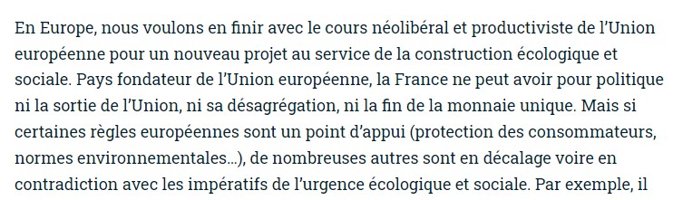 Mais la France, peut-on lire tant dans la déclaration commune LFI-EELV que dans le texte LFI-PS, "ne peut avoir pour politique ni la sortie de l'Union, ni sa désagrégation, ni la fin de sa monnaie unique".