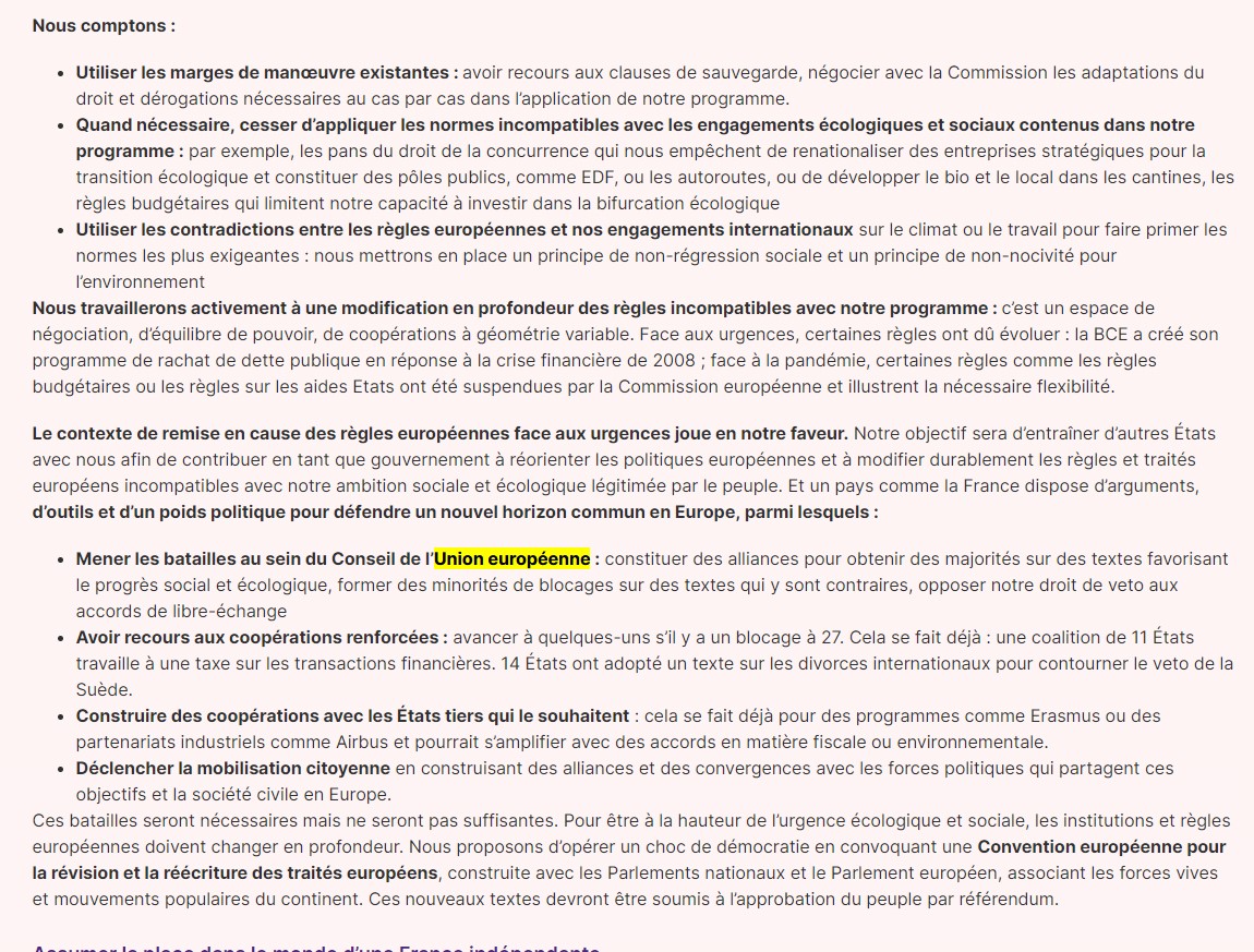 La Nupes a précisé, le 19 mai lors d'une conférence de presse, ses intentions sur les questions européennes. Il y est question de "cesser d'appliquer les normes incompatibles avec les engagements écologiques et sociaux" de son programme, mais aussi d'"utiliser les marges de manoeuvre existantes" dans l'UE actuelle, et de proposer la convocation d'une "Convention européenne pour la révision et la réécriture des traités européens" (voir ci-dessous).