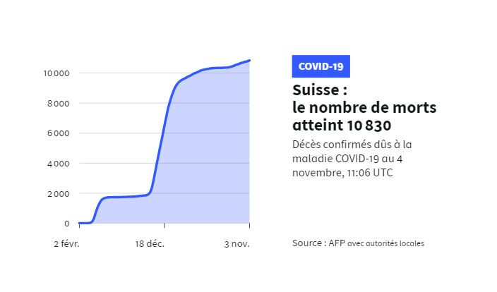Depuis le début de la pandémie, plus de 10.800 personnes sont mortes du Covid en Suisse, pays qui compte environ 8,6 millions d'habitants.