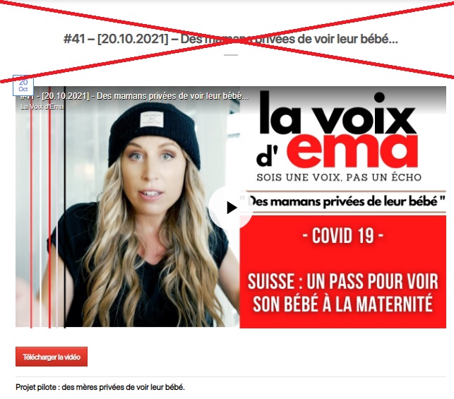 "Si vous êtes maman aujourd'hui et que vous allez accoucher à la maternité de Lucerne, vous êtes sous le coup du nouveau 'projet pilote', c'est-à-dire que pour pouvoir voir votre bébé une fois que vous l’avez mis au monde, il va falloir montrer un certificat Covid (l'équivalent suisse du pass sanitaire, ndlr)", s'insurge la blogueuse, dont les propos au sujet de la pandémie ont déjà été vérifiés dans plusieurs articles de fact-checking (ici, ici), et qui apparaissait dans le film Hold-Up qui évoquait "une manipulation globale" autour du Covid-19 en 2020.