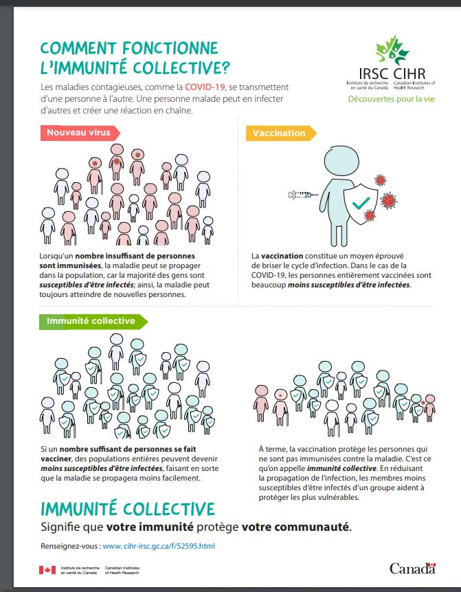 Cette infographie des Instituts de Recherche en santé du Canada explique le principe de l'immunité collective conférée par la vaccination.