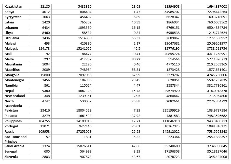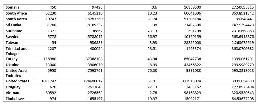 On observe par exemple que sont inclus dans l'étude les données de pays très différents: en superficie, en population, en densité, ou encore touchés à des degrés divers et des moments différents par le Covid: Etats-Unis, Trinidad-et-Tobago, Turquie, Népal, Somalie, Malawi, Brésil, Inde...