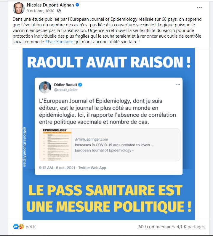L'homme politique français Nicolas Dupont-Aignan a aussi relayé l'étude sur sa page Facebook (4.000 partages depuis le 9 octobre), accompagné d'un message estimant que les campagnes massives de vaccination ne sont pas utiles.
